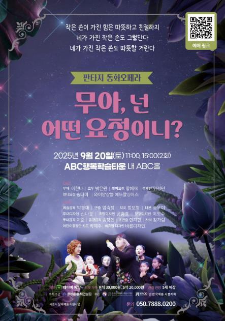 [한국제일신문, 홍영진기자] 시흥시가 ‘2025년 지역문화예술 활성화’ 사업의 하나로 지원하고 두비아뮤직컨설팅에서 주최ㆍ주관하는 판타지 동화 오페라 ‘무아, 넌 어떤 요정이니?’가 오는 9월 20일 오전 11시와 오후 3시, 총 2회에 걸쳐 시흥ABC행복학습타운 ABC홀에서 열린다.