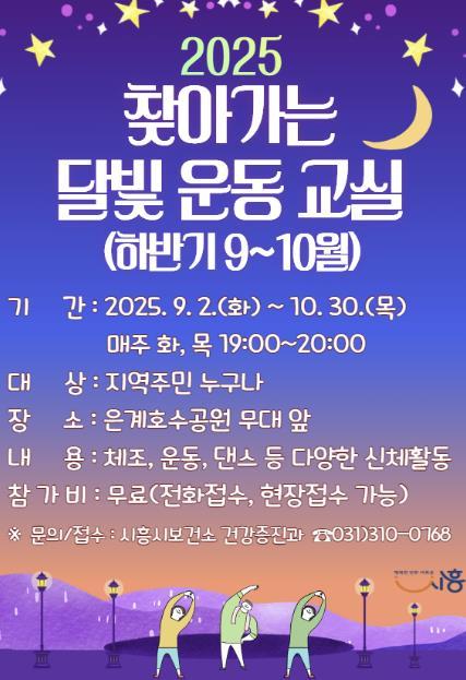 [한국제일신문, 홍영진기자] 시흥시는 시민들의 신체활동 증진과 건강한 생활습관 형성을 위해 운영 중인 ‘찾아가는 달빛 운동교실’을 오는 9월부터 하반기 일정으로 다시 시작한다.
