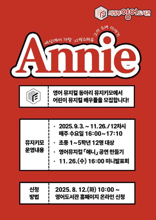 올 하반기 뮤지키모가 완성할 작품은 브로드웨이 인기 뮤지컬 ‘Annie’이며, 초등학교 1학년부터 5학년까지의 학생 12명을 대상으로 운영한다.