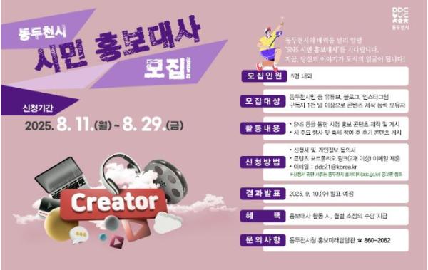 [한국제일신문, 김성옥기자] 동두천시는 오는 8월 11일부터 29일까지 지역 소식과 매력을 SNS를 통해 널리 알릴 ‘2025 시민 홍보대사’를 공개 모집한다고 밝혔다.