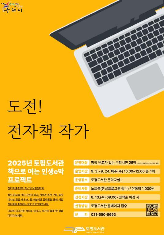 [한국제일신문, 김성옥기자] 구리시 토평도서관은 오는 9월 3일부터 24일까지 매주 수요일, 총 4회에 걸쳐 성인을 대상으로 전자책 출판 프로그램인 ‘책으로 여는 인생e막 : 도전! 전자책 작가’를 운영한다.