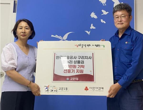 [한국제일신문, 김성옥기자] 구리시 교문1동은 지난 7일 한국석유공사 구리지사로부터 온누리상품권 200만 원을 후원받아 지역 내 취약계층을 위한 여름철 지원사업을 추진했다고 밝혔다.