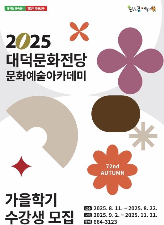 [한국제일신문, 김성옥기자] 대구 남구 대덕문화전당이 오는 8월 11일부터 22일까지 문화예술아카데미 가을학기 수강생을 모집한다. 이번 강좌는 9월 초부터 11월까지 12주 동안 진행되며 미술, 음악, 교양 분야로 26개 강좌를 운영할 예정이다.