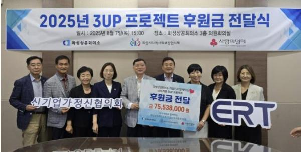 [한국제일신문, 김성옥기자] 화성상공회의소가 7일 화성시지역사회보장협의체에 ‘기업인과 함께하는 사회적 소외계층 3UP 프로젝트’ 사업 추진을 위한 후원금 7553만 원을 전달했다.