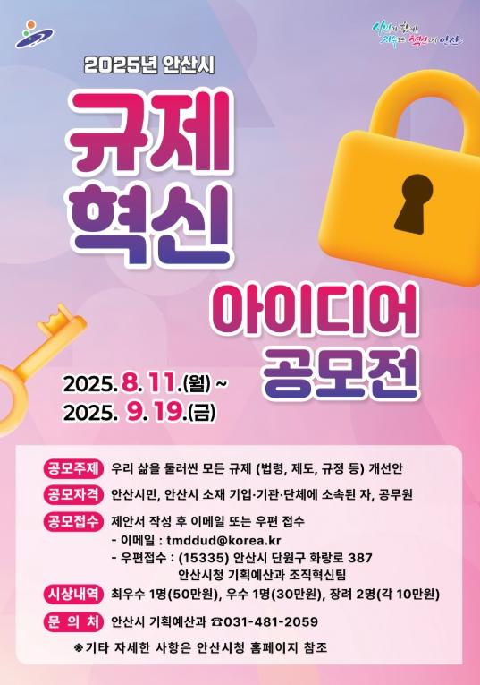 [한국제일신문, 김성옥기자] 안산시는 오는 9월 19일까지 40일간 ‘2025년 안산시 규제혁신 아이디어 공모전’을 개최한다고 11일 밝혔다.
