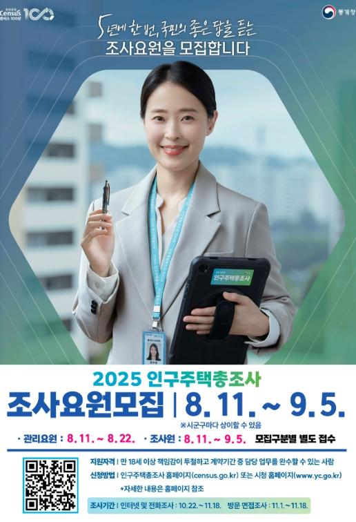 접수는 오는 2025년 8월 11일부터 9월 5일까지이며, 관리요원은 8월 22일까지, 조사원은 9월 5일까지 접수한다.