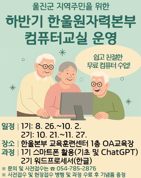 한국수력원자력(주) 한울원자력본부는 AI 기술의 확산과 디지털 환경 변화에 발맞춰, 오는 8월 26일(화)부터 생활 밀착형 정보 교육 '지역주민 컴퓨터 교실'을 운영한다.