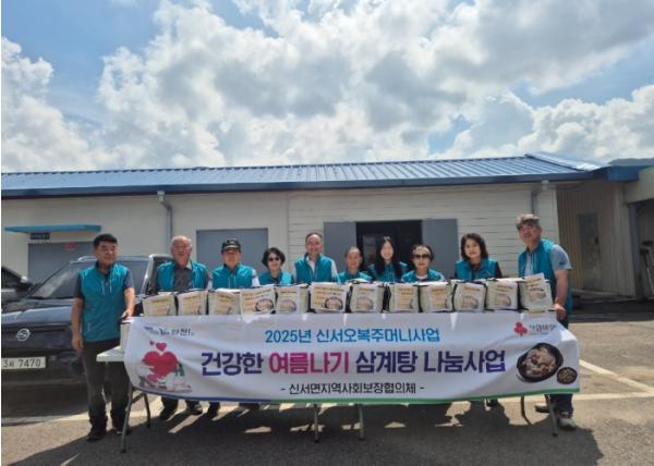신서면지역사회보장협의체는 지역사회 어려운 이웃을 돕기 위한 오복주머니 나눔사업의 일환으로 독거노인 세대 등 취약계층의 영양 보충을 돕기 위해 삼계탕, 직접 담은 오이피클 김치, 과일, 건강음료 등의 식품 꾸러미를 전달했다.