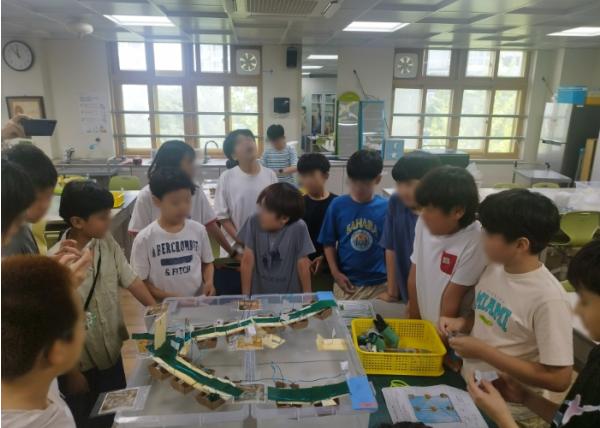 초등과정에서는 두 팀으로 나누어 농수로와 배다리를 제작했다. 학생들은 게임 형식으로 배다리를 만들며 역사와 공학을 배우고, 모형 농수로를 설계해 물길 배분 원리를 익혔다.