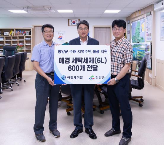 [한국제일신문, 김성옥기자] 청양군은 11일 군수실에서 애경케미칼(주) 청양공장으로부터 세탁세제(6L) 600개, 총 500만 원 상당의 생활필수품을 기탁받고 지역사회와 함께하는 따뜻한 나눔의 시간을 가졌다.
