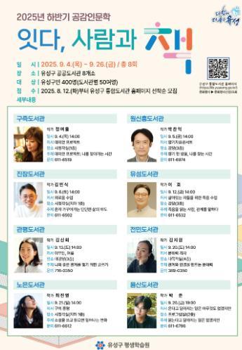 [한국제일신문, 김성옥기자] 대전 유성구는 9월 ‘독서의 달’을 맞아 한 달간 관내 8개 공공도서관에서 2025년 하반기 공감인문학 강연 ‘잇다, 사람과 책’을 운영한다.