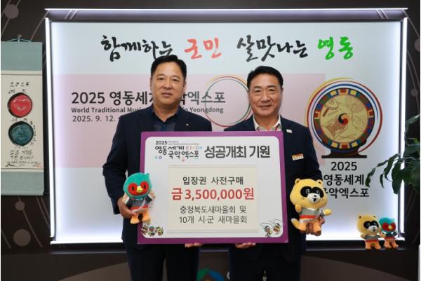 충청북도새마을회(회장 남재호) 및 10개 시군 새마을회는 12일 영동군청에서 ‘2025영동세계국악엑스포(이하 엑스포)’의 성공개최를 기원하며 입장권 구매 약정을 체결했다.