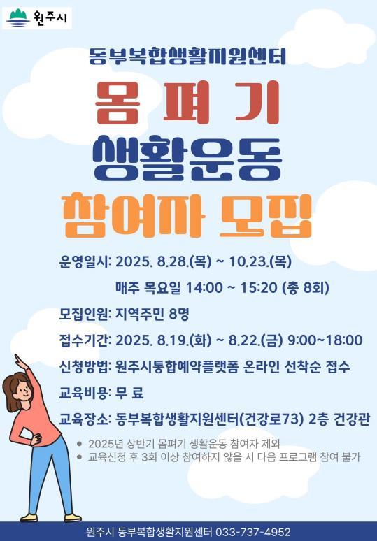 원주시 동부복합생활지원센터, '바른 몸 만들기, 몸펴기 생활운동' 참여자 모집