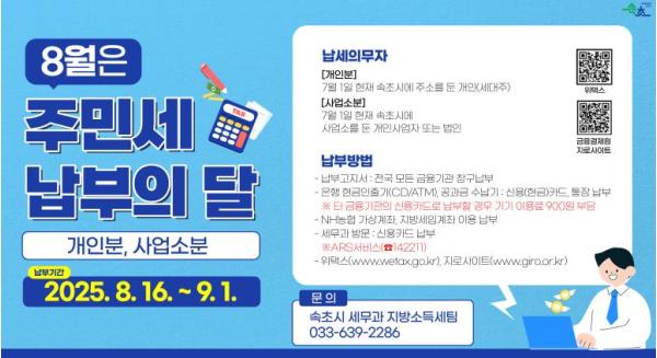 [한국제일신문, 김성옥기자] 속초시는 2025년 8월 주민세 납부의 달을 맞아 총 42,374건, 11억 6,400만 원에 대한 고지서 및 납부서를 발송하고 8월 16일부터 9월 1일까지 납부기간을 운영한다.