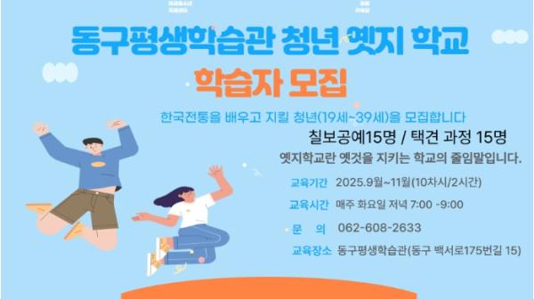 [한국제일신문, 김성옥기자] 광주 동구는 우리의 전통을 배우고 지키는 ‘청년 옛지 학교’가 9월부터 운영하는 ‘칠보공예 및 택견’ 과정의 학습자 30명을 이달 29일까지 모집한다고 밝혔다.