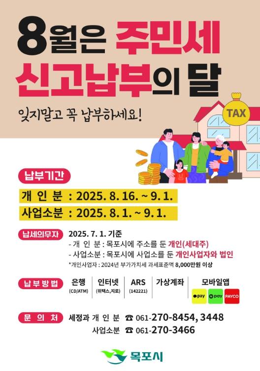목포시, 8월은 주민세 납부의 달…잊지말고 납부하세요!