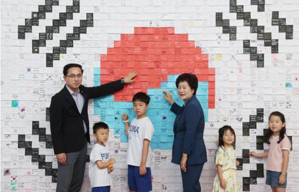 특히, 유치원생부터 어르신까지 남녀노소 다양한 연령층이 참여해 의미를 더했으며, 각자의 마음을 담은 1,000여 장의 메시지가 모여 하나의 거대한 태극기로 완성됐다.