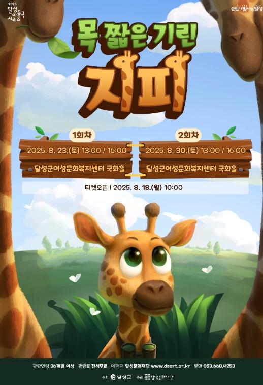 (재)달성문화재단은 어린이들의 여름방학을 맞아 오는 23일과 30일 달성군여성문화복지센터 국화홀에서 온 가족이 함께 관람할 수 있는 뮤지컬 ‘목 짧은 기린 지피’를 개최한다고 밝혔다.