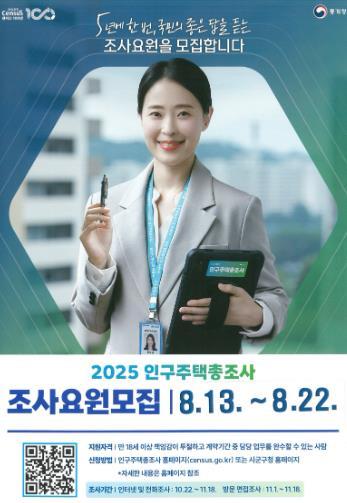 [한국제일신문, 김성옥기자] 화순군은 '2025 인구주택총조사를 위해 오는 8월 13일부터 8월 22일까지 조사요원을 모집한다고 밝혔다.