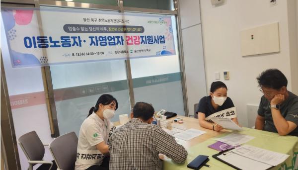 [한국제일신문, 김성옥기자] 울산 북구는 13일 북구 진장디플렉스 이동노동자쉼터에서 이동노동자 및 자영업자 대상 찾아가는 건강지원사업을 진행했다.