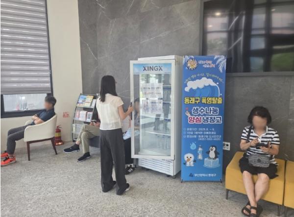 [한국제일신문, 김성옥기자] 부산 동래구는 연일 이어지는 폭염으로부터 구민 건강을 지키고 온열질환 예방하기 위해, 구청 1층 로비와 수안역 임진왜란역사관 영상실(무더위쉼터)에‘생수 나눔 양심냉장고’를 설치·운영한다고 11일 밝혔다.