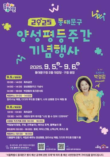 이필형 동대문구청장은 “토크콘서트, 어린이 뮤지컬, 키즈카페 등 다양한 프로그램을 통해 모든 세대가 함께 양성평등의 가치를 나누고, 평등한 사회 분위기 확산에 기여하겠다.”라고 말했다.