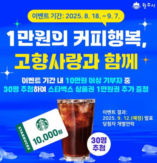 이번 행사는 8월 18일부터 9월 7일 사이 원주고향사랑기부에 참여한 기부자를 대상으로 진행된다. 무작위 추첨을 통해 30명에게 모바일 스타벅스 상품권 1만 원을 제공할 계획이다.
