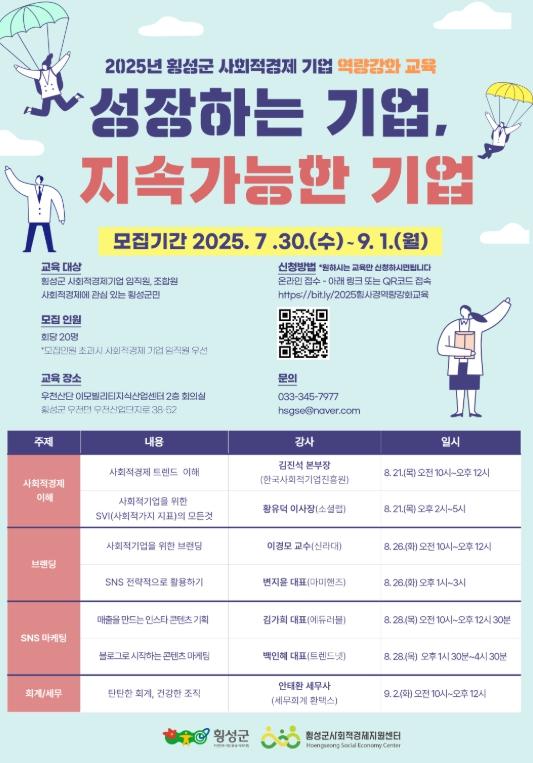 [한국제일신문, 김성광기자] 횡성군은 사회적경제기업의 지속 가능한 성장을 지원하기 위해 ‘2025년 사회적경제 기업 역량강화 교육’을 오는 21일부터 9월 2일까지 진행한다.