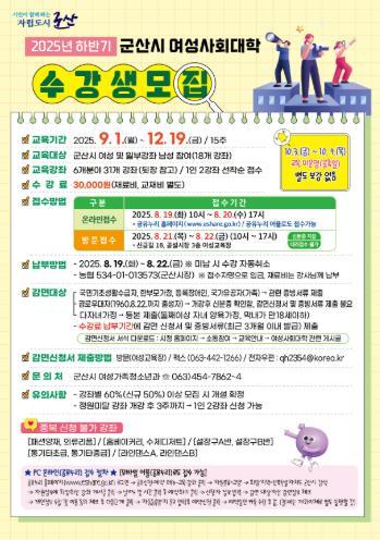 [한국제일신문, 김성관기자] 군산시 여성사회대학이 오는 8월 19일부터 22일까지 하반기 프로그램 수강생을 선착순 모집한다.