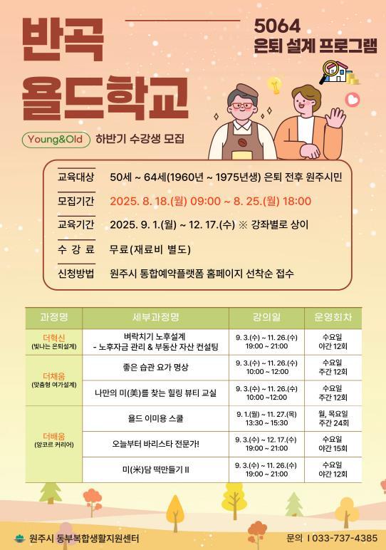 홍창희 동부복합생활지원센터 소장은 “연금부터 부동산 자산 관리, 건강한 기초체력 증진, 커리어 설계까지 5064세대의 수요에 맞춘 분야별 전문 교육을 준비한 만큼, 은퇴 전후 원주시민들에게 큰 도움을 줄 것으로 기대한다”라고 말했다.