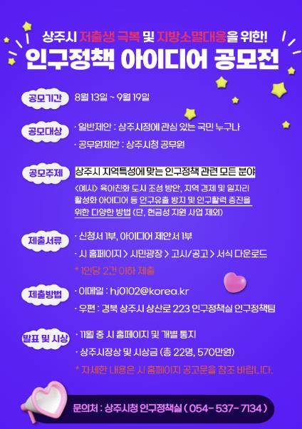 [한국제일신문, 김성옥기자] 상주시는 인구감소와 지역소멸 문제에 대한 시민들의 관심을 높이고, 저출생 극복과 인구 유입 확대를 위한 창의적인 아이디어를 발굴하고자 ⌜상주시 인구정책 아이디어 공모전⌟을 개최한다.