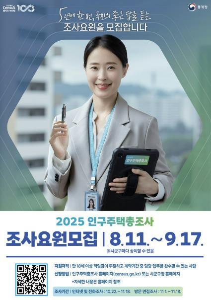 [한국제일신문, 이미란기자] 김제시는 오는10월 22일부터 11월 18일(인터넷 및 전화조사 10.22.~11.18., 방문면접조사 11.1.~11.18.)까지 실시하는 2025년 인구주택총조사의 성공적인 추진을 위해 사명감과 책임감 있는 조사관리요원 7명, 조사원 61명 등 68명의 조사요원을 모집한다.