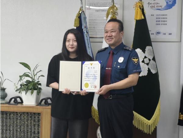 [한국제일신문, 김성옥기자] 인천 계양구시설관리공단 효성수영장 안내데스크 직원이 보이스 피싱예방 및 피해방지에 기여한 공로를 인정받아 계양경찰서에서 감사장을 받았다.