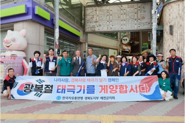 [한국제일신문, 김성옥기자] 한국자유총연맹 예천군지회(회장 김경섭)는 제80주년 광복절을 맞아 14일 오전 10시, 예천읍 천보당 사거리에서 태극기 나눔 행사를 펼쳤다.