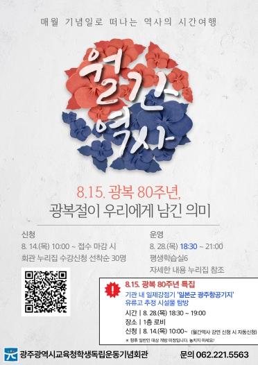 [한국제일신문, 김성옥기자] 광주광역시교육청학생독립운동회관은 14일부터 28일까지 ‘월간역사’ 특강 수강생을 모집한다.