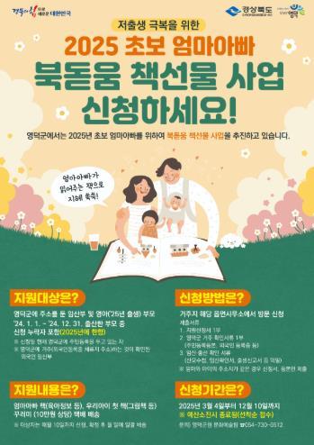 [한국제일신문, 김성옥기자] 영덕군은 경상북도와 함께 ‘저출생과 전쟁 100대 실행 과제’의 일환으로 ‘2025년 초보 엄마 아빠 북돋움 책 선물 사업’을 시행한다.