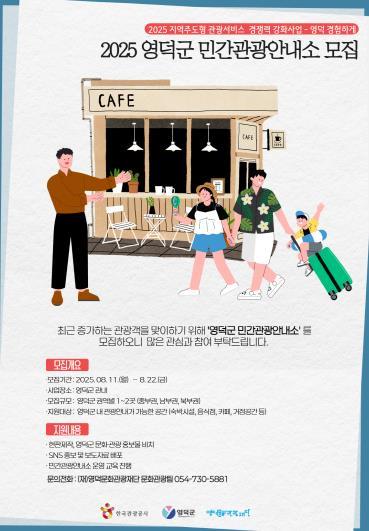 (재)영덕문화관광재단은 영덕군 관광 활성화에 일익을 담당하게 될 '2025 영덕군 민간관광안내소' 사업을 개시하면서 참여할 사업체를 모집한다고 밝혔다.