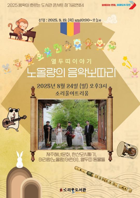 [한국제일신문, 김성옥기자] 오산시 소리울도서관은 오는 8월 24일 오후 3시, 소리울아트리움에서 『2025 음악이 흐르는 도서관 콘서트 정기공연 #4 – 노올량의 음악보따리』를 개최한다고 밝혔다.