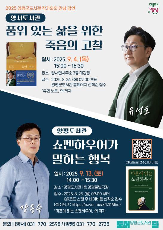 강연 신청은 선착순으로 진행된다. 유성호 작가 강연 신청은 8월 26일 오전 9시부터 29일까지 4일간 양평군도서관 누리집에서, 강용수 작가 강연 신청은 8월 25일 오전 9시부터 28일까지 4일간 네이버폼을 통해 접수한다. 자세한 내용은 양평군도서관 누리집에서 확인할 수 있다.