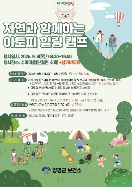 [한국제일신문, 김성옥기자] 양평군은 아토피피부염 환아와 그 가족을 대상으로 ‘자연과 함께하는 아토피 힐링 캠프’에 참여할 가족을 모집한다고 밝혔다.