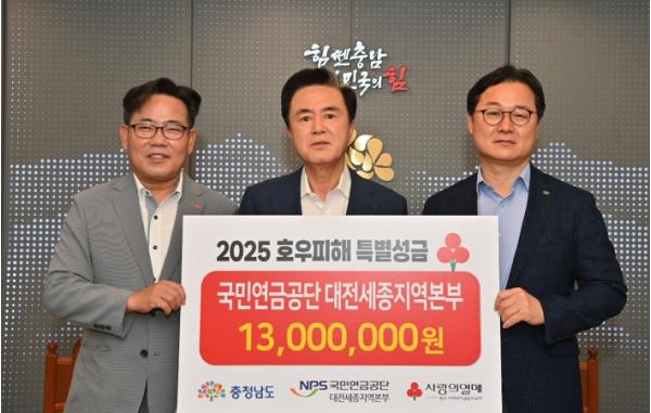 [한국제일신문, 김성옥기자] 충남도는 국민연금공단 대전세종지역본부로부터 호우 피해복구 지원 성금 1300만 원을 전달받았다고 14일 밝혔다.