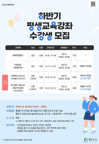 [한국제일신문, 김성옥기자] 경상북도교육청 울진도서관은 오는 9월부터 12월까지 ‘하반기 평생교육강좌 및 늘봄도서관’을 운영한다.