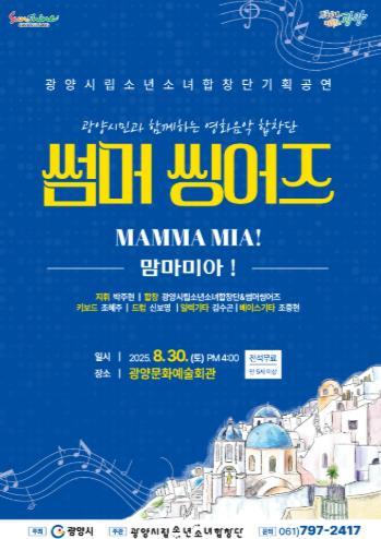 [한국제일신문, 김성옥기자] 광양시립소년소녀합창단이 여름방학을 맞아 오는 8월 30일 오후 4시 광양문화예술회관 대공연장에서 기획공연 ‘썸머씽어즈–맘마미아!’를 선보인다.