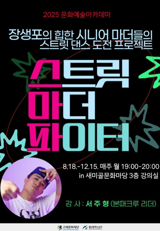 [한국제일신문, 김성옥기자] 고래문화재단이 운영하는 새미골 문화마당에서는 18일부터 시니어 세대를 위한 스트릿댄스 프로그램 ‘스트릿 마더 파이터’를 개강한다.