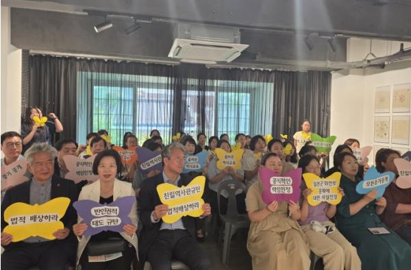 행사에는 도내 여성단체와 시민사회단체, 광복회 전북지회, 전북겨레하나 등 60여 명이 참석해 피해자들의 고통과 용기를 되새겼다. 추모사와 전시 작가 소개, 피해자를 기리는 퍼포먼스가 이어지며 현장 분위기를 더했다.