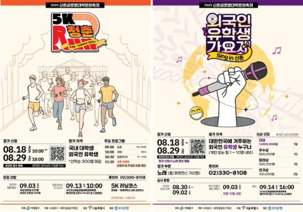 [한국제일신문, 김성옥기자] 서대문구가 9월 12∼14일 열리는 ‘2025 신촌글로벌대학문화축제’ 프로그램 중 ‘청춘런’과 ‘외국인 유학생 가요제’ 참가자를 이달 18일부터 모집한다.
