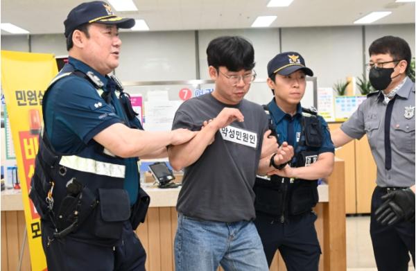 훈련은 여권 발급을 요구하던 민원인이 갑작스레 폭언과 폭행으로 돌변하는 상황을 가정해 실제상황처럼 진행됐다. ▷민원인 진정 유도 ▷사전 고지 후 녹음·녹화 ▷비상벨 호출 ▷피해 공무원 보호 및 내방객 대피 ▷특이 민원인 제압 후 경찰 인계 등 순으로 대응 절차가 이뤄졌다.
