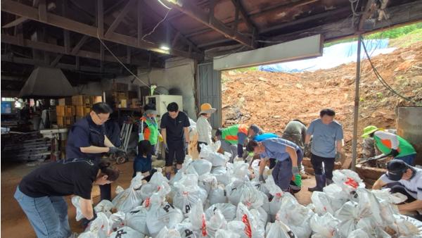 복구에 참여한 인력들은 중장비를 동원해 공장 내부에 쌓인 토사와 폐기물을 제거했다. 또, 재차 발생할 수 있는 피해를 막기 위해 마대자루를 쌓아 산기슭을 보강했다.