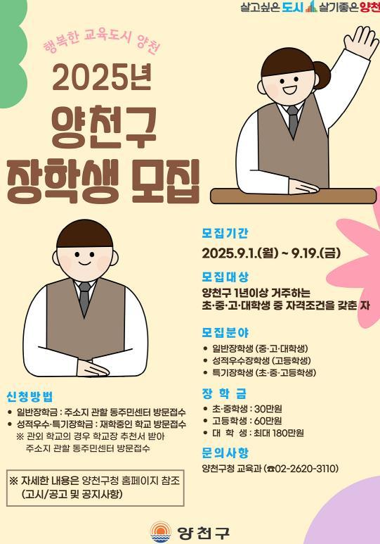 장학생 선발 결과는 11월 초 개별 통보되며, 장학금은 같은 달 중순 지급된다. 자세한 사항은 양천구청 교육과로 문의하면 된다.