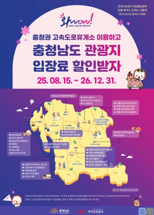 할인 적용 대상은 충청권 내 주요 고속도로에 위치한 휴게소로 ▲경부고속도로(망향휴게소, 천안삼거리휴게소, 옥천휴게소, 황간휴게소 등) ▲서해안고속도로(행담도휴게소, 서산휴게소) ▲당진영덕고속도로(예산휴게소, 공주휴게소 등) ▲서천공주고속도로(부여백제휴게소) 이용객이 해당 휴게소에서 1만 원 이상 결제한 영수증(식사, 간식, 편의점 등)을 제시하면 제휴 관광지 입장 시 입장료 할인 혜택을 제공한다.